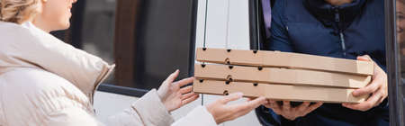 cropped view of woman taking pizza boxes from delivery man in car, banner