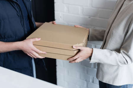 Cropped view of businesswoman and courier holding pizza boxes in office