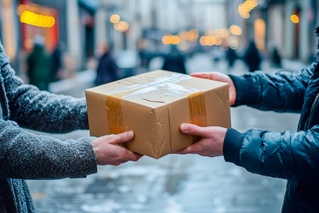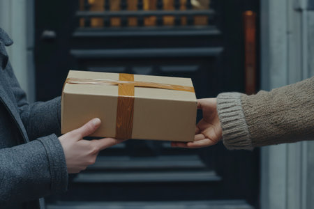 A scene depicting two individuals exchanging a brown cardboard box at a doorstep, highlighting themes of delivery, interaction, and urban living.