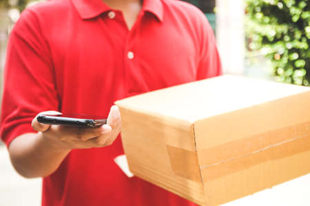 home delivery service man in red uniform and young woman customer appending signature in digital mobile phone receiving parcel post box from courier at home, express delivery, online shopping concept