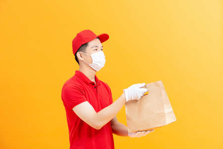 delivery guy hold takeaway package look camera wear mask red t-shirt cap isolated yellow color background