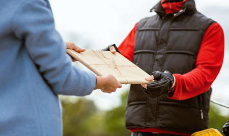 Woman hand accepting a delivery of boxes from deliveryman. Home delivery courier service and shipment concept