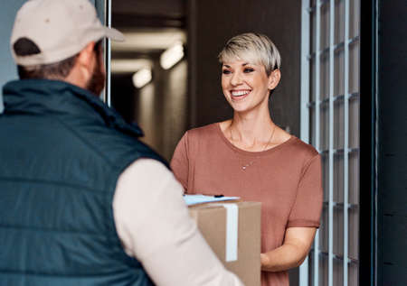 We always deliver right on time. Shot of a courier making a delivery to a customer at her home.