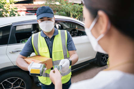 Asian delivery man accept credit card using a credit card reader while delivering products to customers at home, Cash on delivery concept with credit card.