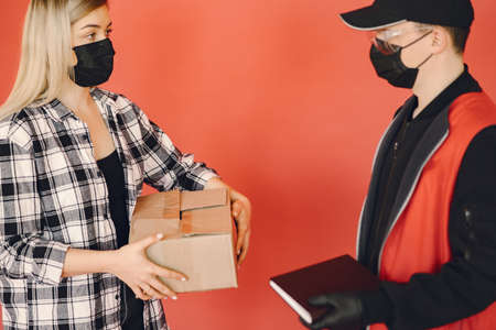 Delivery man in a medic mask with woman