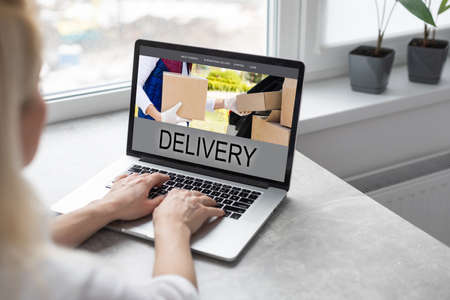 delivery icon on laptop keyboard. Online shopping, ecommerce and retail sale concept, delivery for customers ordering things from retailers websites using internet