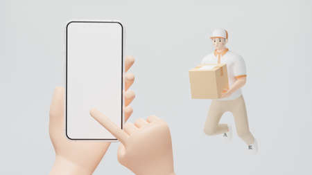 Human hand using the index finger to slide the screen of the smartphone Delivery staff floating in the air holding a box 3d render cartoon character Online shopping concept