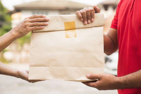 The delivery staff wears red shirts, carrying brown paper boxes and smartphones. Stand in front of the client's house. Online shopping business concept, social distance. New Normal