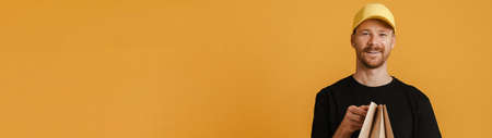 White delivery man in cap smiling while posing with paper bags isolated over yellow background