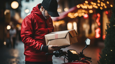 Delivery man in red uniform delivering parcel box on scooter at night