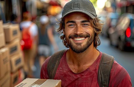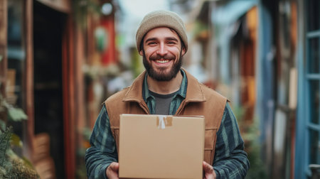 Delivery man with a package, bright outdoor, happy and efficient