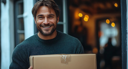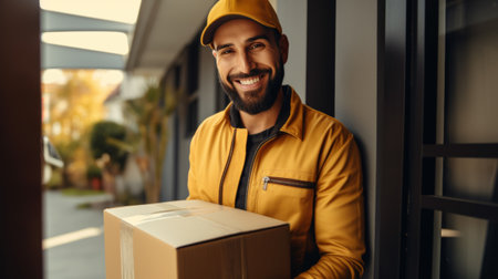 smiling courier hands over well branded package cheerful customer standing their doorstep scene highlights satisfaction and positive interactions in customer service