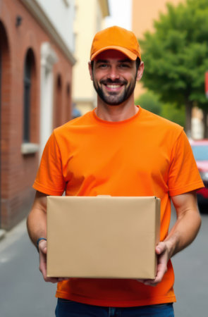 Smiling delivery man wearing an orange t-shirt and cap, holding a cardboard box while delivering a package through the bustling city streets and neighborhoods