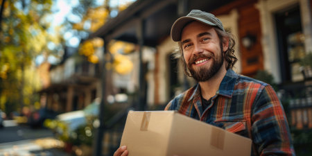 Smiling delivery man in plaid shirt holding a package in a suburban neighborhood during autumn.