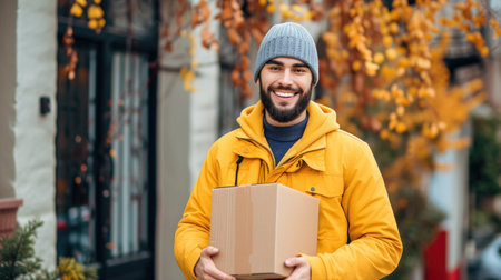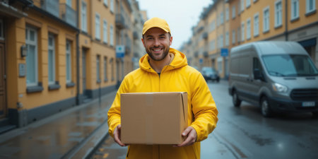 delivery man in yellow raincoat holding box and smiling on street