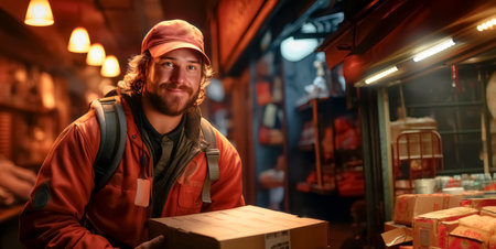 One adult male delivering boxes outdoors in the city at dusk generated by artificial intelligence