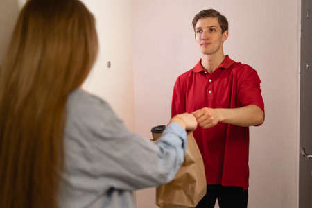 Food delivery concept. deliveryman handing over a package of an order to client. Takeaway food delivery service. customer receives the eco package