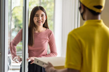 Asian Delivery man wearing mask send a pizza food on front home receiver shipping deliver social distancing while the virus is spreading and prevention crisis coronavirus covid-19 front home customer.