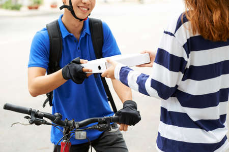 Woman hand accepting a delivery of boxes from deliveryman. Home delivery courier service and shipment concept