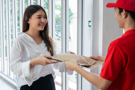 Asian delivery young man in blue uniform smile and holding letter or document envelope in front house and Asian woman accepting a delivery of envelope from deliveryman. Advertising, Transportation.