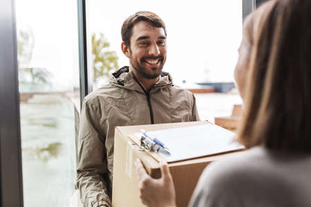 delivery man with parcel box and customer at home