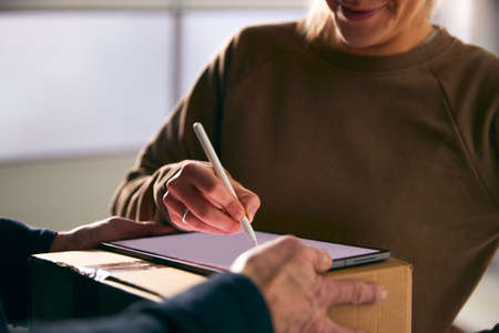 Woman Signing For Courier Delivery To Office Using Digital Tablet