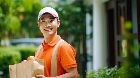 Asian deliver man in orange uniform holding box standing in front of customer home.