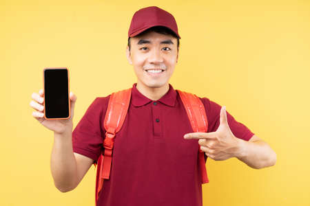 Portrait of a young courier, delivery man in red uniform with a thermal backpack isolated on a red background. Fast home delivery. Online order. Courier delivers groceries home.