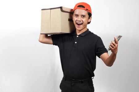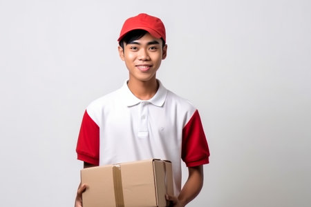 Red Delivery handsome asian man holding parcel cardboard box on isolated white background.