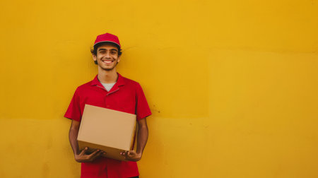 Smiling courier in red uniform holding a box against a yellow wall. Reliable and cheerful delivery service.