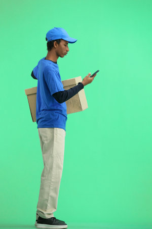 The deliveryman, in full height, on a green background, with a box, talking on the phone