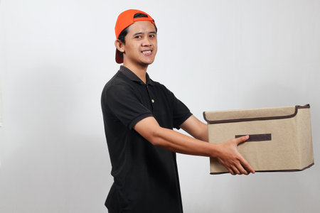 Happy Asian man in t-shirt and cap holding empty box isolated over white background, Delivery service concept