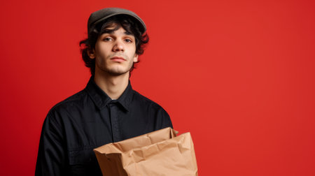 food delivery person, wearing branded shirt and cap, carrying hot meals to customers doors, created with generative ai