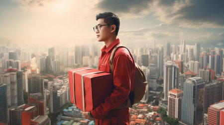 delivery asian man over cityscape with box in hands, for logistic and shipping cargo service business,