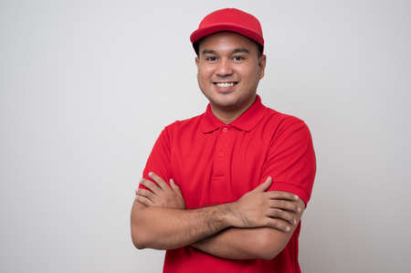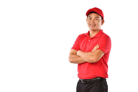 Smiling young handsome asian delivery man in red uniform standing with arm crossed on isolated white background.
