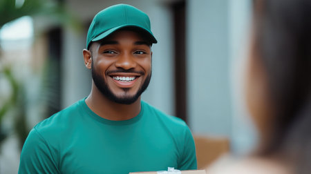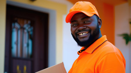 Vertical portrait of African American delivery worker holding box and smiling at camera