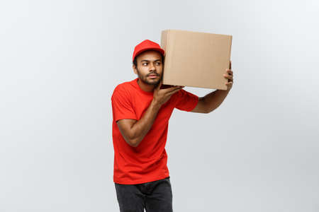 Delivery Concept - Portrait of Curious African American delivery man listen inside a box package. Isolated on Grey studio Background. Copy Space.