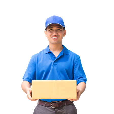 Young smiling asian delivery man in blue uniform holding box parcel cardboard on isolated white background.