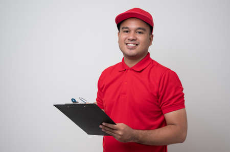 Young smiling asian delivery man in red uniform holding clip board standing on isolated white background.