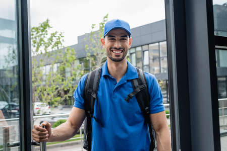 cheerful delivery man carrying yellow backpack and smiling on blue, banner