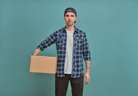 Portrait Of Young Delivery Man Holding Cardboard Box Against Plain Background