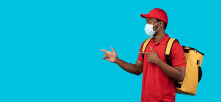 Look Here. Portrait of black delivery man wearing medical face mask and yellow thermo backpack, pointing away at copy space isolated on blue studio background, banner, advertisement concept, panorama