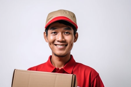 Red Delivery handsome asian man holding parcel cardboard box on isolated white background.