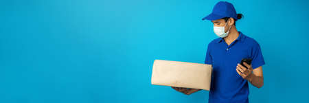 Asian delivery man wearing mask holding parcel box and show screen of phone on blue background in studio