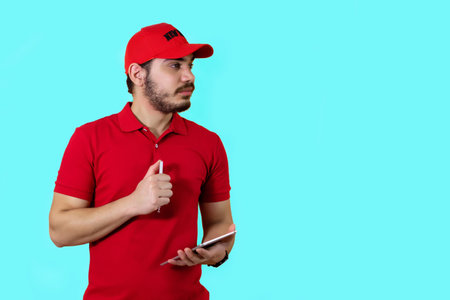 Man hold tablet wear cap and red t-shirt isolated on light blue background.