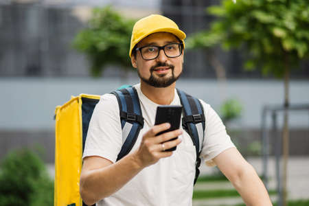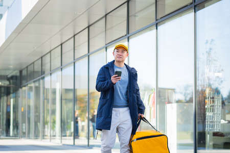 asian male food courier using mobile using mobile phone app on smartphone while standing city street with insulated with thermal backpack delivering food. looking customer address. purchase online map