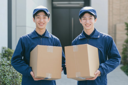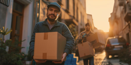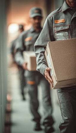Professional movers in gray uniforms are seen handling packages. The image features warm lighting and a shallow depth of field, highlighting the occupational setting.