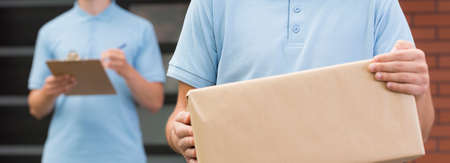 Delivery service concept. young delivery man holding box and writing something on clipboard.