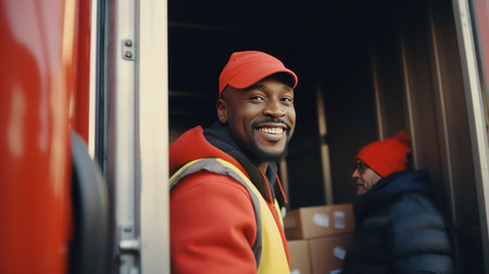 A team of delivery personnel unloads packages from a large van, working together to distribute goods in a residential neighborhood. AI generation