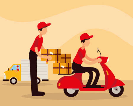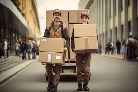 Workers loading cardboard boxes into a delivery truck. Online orders, warehouse logistics, e-commerce fulfillment.